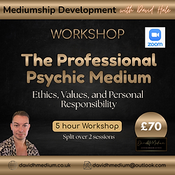 PLEASE NOTE THIS IS A 2 SESSION EVENT ON THE FOLLOWING DATES: * Wednesday 18th February * Wednesday 25th February YOU MUST BE ABLE TO ATTEND BOTH DATES Are you just starting your journey as a psychic or a medium? Or are you already on the journey but are looking for knowledge about the ethics we need to remember when doing this work? Well either way this interactive workshop should answer that question. I’m very passionate about the topic of this workshop and I want to be able to share that with others doing this work to make sure people are doing it the right way - well, in my opinion, at least. But many people may wonder why there should be a workshop on the ethics in psychic and mediumship work; isn’t it common sense? Well you would think that, but there are lots of things we don’t consider when doing this work. Just so you have an idea of what we will cover, please see the contents below: Personal Responsibility - We talk in general about our responsibilities as psychics and mediums. Working as a psychic - We talk about the ethics involved in working psychically. What can we say and can’t we say? Should we edit information or not? Includes an example recording of a psychic reading. Working as a medium - We talk about the ethics involved when we are working as mediums. What can we say and can’t we say? Should we edit information or not? Values - We think about why we actually want to do the work, and we turn this into a set of values personally written by you Professionalism - What does it mean to be professional in this work? What things do we need to consider in order to present ourselves as professional Note: This workshop does not involve reading for each other, but there are other activities in order to understand the subject. Mini Quiz - A short 10 question quiz to test your knowledge. Note that this is not an assessment and therefore there is no pass mark. It’s a simple way for you to test yourself to see what knowledge you have attained from the module. Zoom Video The workshop will be done via zoom video, therefore you must make sure you have access to Zoom and are familiar with how it works. This is an interactive workshop and therefore you must have a working microphone and camera. The workbook will be sent via email 7 days before the event starts. Note: The workshop will not be recorded and therefore you must be present for the entire duration of the workshop.