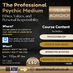 PLEASE NOTE THIS IS A 2 SESSION EVENT ON THE FOLLOWING DATES: * Monday 4th May * Monday 11th May YOU MUST BE ABLE TO ATTEND BOTH DATES Are you just starting your journey as a psychic or a medium? Or are you already on the journey but are looking for knowledge about the ethics we need to remember when doing this work? Well either way this interactive workshop should answer that question. I’m very passionate about the topic of this workshop and I want to be able to share that with others doing this work to make sure people are doing it the right way - well, in my opinion, at least. But many people may wonder why there should be a workshop on the ethics in psychic and mediumship work; isn’t it common sense? Well you would think that, but there are lots of things we don’t consider when doing this work. Just so you have an idea of what we will cover, please see the contents below: Personal Responsibility - We talk in general about our responsibilities as psychics and mediums. Working as a psychic - We talk about the ethics involved in working psychically. What can we say and can’t we say? Should we edit information or not? Includes an example recording of a psychic reading. Working as a medium - We talk about the ethics involved when we are working as mediums. What can we say and can’t we say? Should we edit information or not? Values - We think about why we actually want to do the work, and we turn this into a set of values personally written by you Professionalism - What does it mean to be professional in this work? What things do we need to consider in order to present ourselves as professional Note: This workshop does not involve reading for each other, but there are other activities in order to understand the subject. Mini Quiz - A short 10 question quiz to test your knowledge. Note that this is not an assessment and therefore there is no pass mark. It’s a simple way for you to test yourself to see what knowledge you have attained from the module. Zoom Video The workshop will be done via zoom video, therefore you must make sure you have access to Zoom and are familiar with how it works. This is an interactive workshop and therefore you must have a working microphone and camera. The workbook will be sent via email 7 days before the event starts. Note: The workshop will not be recorded and therefore you must be present for the entire duration of the workshop.